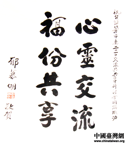 臺灣新黨主席郁慕明為研討會親筆題寫賀詞“心靈交流 福份共享” (中國臺灣網 孫金誠 攝)