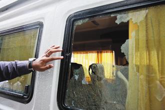 遭恐怖份子襲擊,臺灣TVBS電視臺《食尚玩家》劇組乘坐的巴士車窗粉碎。來源:臺灣《聯(lián)合報》