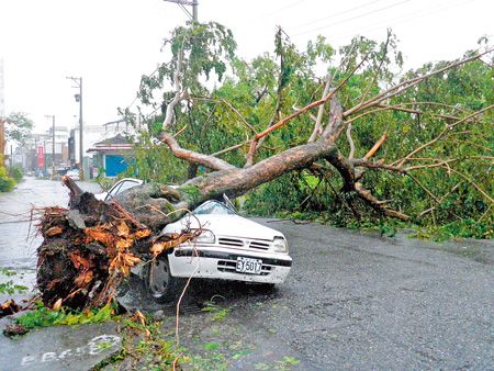 “凡亞比”臺風威力驚人,將路樹連根拔起,壓毀停在一旁的車輛,幸無人傷亡。來源:臺灣《中國時報》