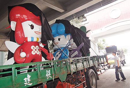 連花博吉祥物,也由貨車運送到濱江街的暫置區躲避臺風。來源:臺灣《中國時報》