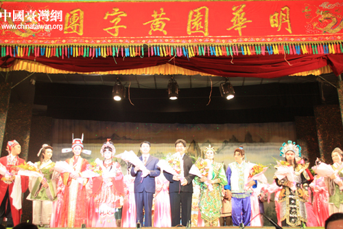 臺灣明華園黃字劇團與漳州市薌劇團同臺獻演大型歌仔戲《周公法斗桃花女》,圖為劇團團長及主要演員謝幕。(中國臺灣網 胡珊珊 攝影)