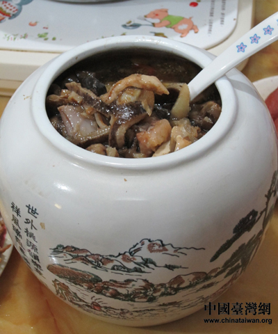 佛跳墻。閩菜系的傳統(tǒng)佳肴。裝于圓壇中,引其諧音、“團(tuán)圓”之意。