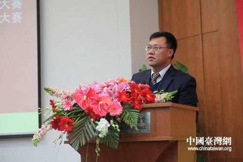 北京師范大學校長助理陳曉龍在“首屆兩岸大學生網絡商務創新應用大賽”啟動儀式上致辭。(中國臺灣網 普燕 攝)