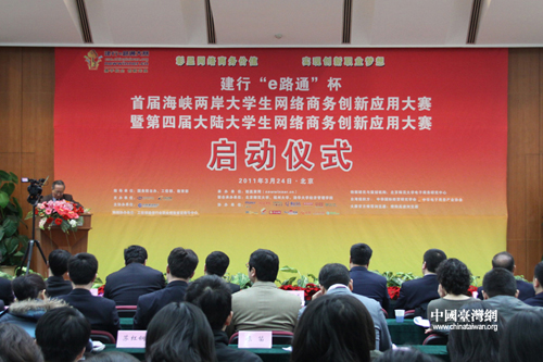 3月24日上午,由中國互聯網協會和中國臺灣網共同主辦的“建行e路通杯首屆海峽兩岸大學生網絡商務創新應用大賽暨第四屆大陸大學生網絡商務創新應用大賽”在京舉行啟動儀式。主辦方表示,期望能借此加強兩岸互聯網業界、以及高校學生的交流借鑒,促進共同發展。(中國臺灣網 王偉 攝)