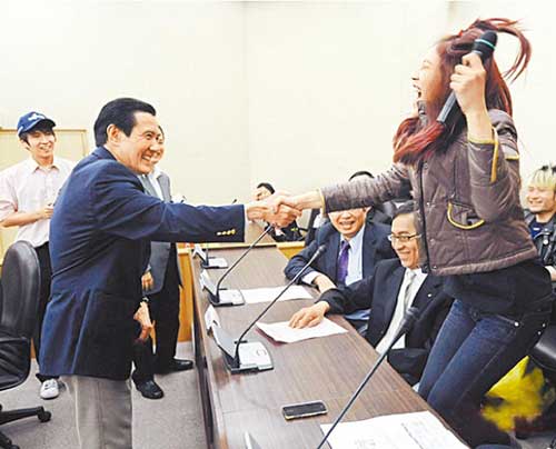 一名女大學生與馬英九握到手,興奮地大叫。圖片來自網絡