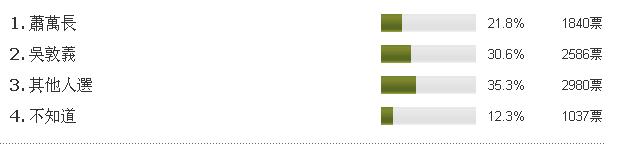 臺灣Yahoo!奇摩網(wǎng)在馬英九2012副手民調(diào)選項中設(shè)置4個選項。一是支持蕭萬長;一是支持吳敦義;一是其他人選;一是不知道。經(jīng)過8443人的投票,結(jié)果于今日出爐。