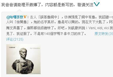 李敖在首篇博文中表示,古人“誤落塵網中”,彷佛預見了網中有塵。我認識一位可愛的女人叫“徐開塵”,她的名字真好。塵是可以開的。現在天下大亂了,阿貓阿狗都會舞文弄墨了,“康熙”都低級趣味了。好吧,如凱撒所說:Veni, vidi, vici.我來了、我看見了、我征服了。不是寫140個字嗎?拿牛刀的來了。