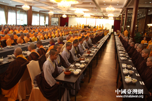 兩岸千僧齋供僧法會今日中午在福州舉行,近千位在此間參加閩臺佛教文化交流周活動的僧人集體過堂。(中國臺灣網 楊麗 攝)