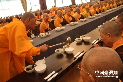 兩岸千僧齋供僧法會今日中午在福州舉行,近千位在此間參加閩臺佛教文化交流周活動的僧人集體過堂,福州涌泉寺方丈普法法師主持儀式。(中國臺灣網 楊麗 攝)
