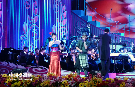 雷佳與臺灣歌手范逸臣演唱《那魯灣情歌》(中國臺灣網 李徽 攝)