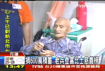 臺(tái)灣花蓮縣82歲的退伍老兵洪中海,將600萬(wàn)新臺(tái)幣的畢生積蓄全部捐出,近日榮登亞洲慈善英雄榜。圖片來(lái)源:臺(tái)灣TVBS電視臺(tái)