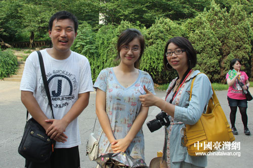 北京交通大學(xué)趙暉、武漢大學(xué)喻釋然、臺(tái)灣大學(xué)李曉蓉三人離別前合影留念(中國(guó)臺(tái)灣網(wǎng) 李丹 攝)