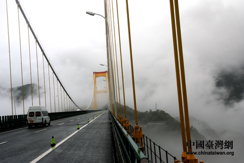 中國臺灣網9月19日恩施消息 今天上午,兩岸記者恩施文化旅游采風團乘車從宜昌奔赴恩施,沿途領略了神奇的滬蓉西高速公路,煙雨蒙蒙中感受著天路傳奇。