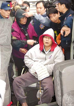 五月天樂團(tuán)主唱阿信的堂哥陳文宗(圖前坐輪椅),因遭槍擊下半身癱瘓,涉嫌由女看護(hù)陳美云(圖后穿紅衣婦人)推著輪椅四處販毒,昨日被臺北市刑偵隊(duì)逮捕送辦。(圖片來自臺灣媒體)