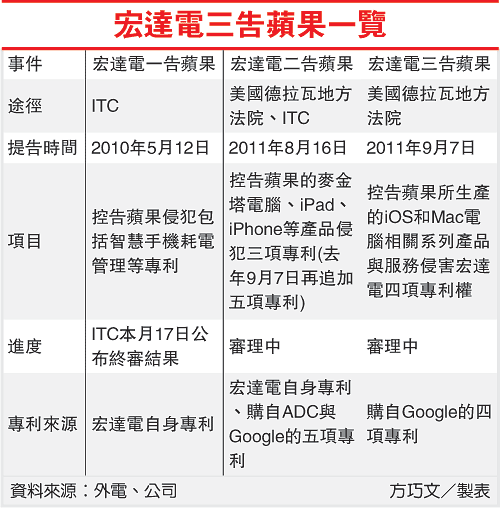 2010年5月,宏達(dá)電發(fā)起反擊蘋果的專利攻勢(shì),首度在ITC對(duì)蘋果提出侵權(quán)告訴,認(rèn)為蘋果侵犯宏達(dá)電包括電源管理在內(nèi)等四項(xiàng)專利。
