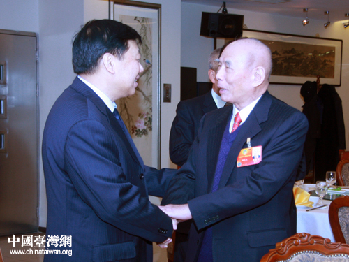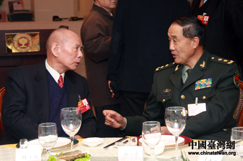 3月8日,黃埔軍校同學會在京舉辦兩會代表、委員聯誼招待會。圖為林上元與全國人大代表徐小巖交談。(中國臺灣網 王偉 攝)