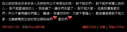 據報道,Makiyo昨天在微博上寫下“從以前到現在好多好多人支持我所以才有現在的我,對不起你們,對不起所有關心我的人,對不起愛過我的人,我做錯了,讓你們失望了,對不起大家”,表達出自己的歉意。對于Makiyo在微博的道歉文,有不少網友指出,雖然接受她的道歉,但還是認為她該退出演藝圈,不要再待在臺灣。
