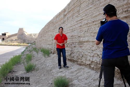 臺灣記者何勁松和方昶懿在嘉峪關拍攝畫面。(中國臺灣網 郜利敏 攝)
