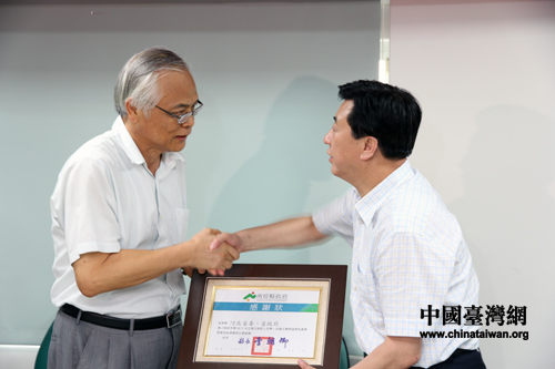 南投縣副縣長陳志清(左)代表災(zāi)區(qū)民眾感謝河北省的賑災(zāi)善舉。(中國臺(tái)灣網(wǎng) 馬迪 攝)