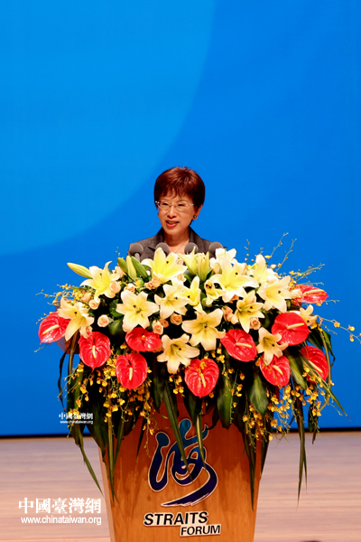 17日,第四屆海峽論壇大會在廈門國際會議中心舉行。圖為中國國民黨副主席洪秀柱在大會致辭。(中國臺灣網 王偉 攝)
