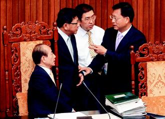 國民黨政策會執行長林鴻池(右二)、國民黨團書記長吳育升(右一)及民進黨團干事長潘孟安(左二),在昨天全院委員會議上與“立法院長”王金平(左一)交換意見。(圖片來自臺媒)