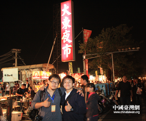 北交大學(xué)生莫高泉與成功大學(xué)學(xué)生劉韋億在臺南大東夜市(中國臺灣網(wǎng) 王文英 攝)
