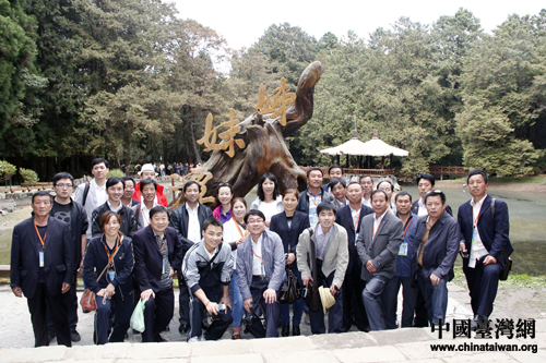 參訪團(tuán)團(tuán)在阿里山景區(qū)合影留念。(中國臺灣網(wǎng) 于斯文 攝)