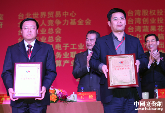 與會領導嘉賓向臺灣電機電子工業(yè)同業(yè)公會、北京通訊信息協(xié)會機構頒發(fā)京臺科技論壇突出貢獻紀念牌。(中國臺灣網(wǎng) 王思羽 攝)