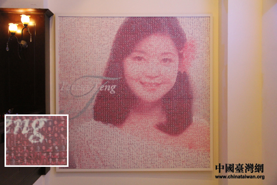 在鄧麗君音樂主題餐廳,這幅像掛在1樓到2樓的樓梯通道的墻上。仔細(xì)一看,內(nèi)藏玄機(jī):原來是用鄧麗君不同時(shí)期拍攝的3000張相片拼接而成。(中國(guó)臺(tái)灣網(wǎng) 何建峰 攝)