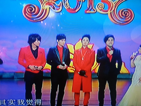 F4重現江蘇衛視蛇年春晚,左起依次是言承旭、周渝民、吳建豪、朱孝天(圖拍截自網絡視頻)