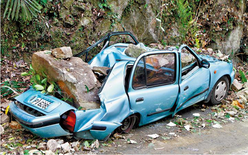 南投強震,草屯鎮雙冬山區一輛小轎車被落石砸扁,幸駕駛僅肩頸受傷。(圖片來自臺媒)