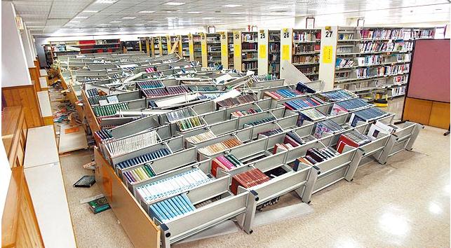 臺中市新民高中圖書館內書架昨像骨牌“全倒”,3萬多本書散落一地。中興大學圖書館也是書架倒塌,當時有500多名學生在館內,吳姓學生說:“真是阿彌陀佛,我距離書架不到1公尺,書架搖晃得好厲害,嚇死人了!”昨中興大學停課1天。