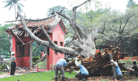 臺(tái)南市孔廟一棵六十年老樹傾倒,壓壞孔廟東側(cè)“禮門”,古跡修復(fù)工站在禮門前,感到相當(dāng)不舍,一旁則是急著搶救老樹的樹醫(yī)生。圖片來(lái)自臺(tái)灣《聯(lián)合報(bào)》