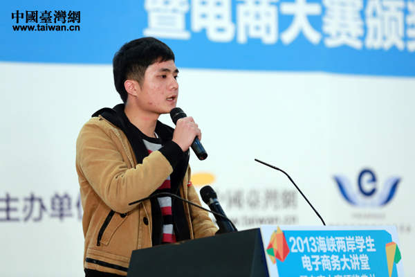 20日下午,由中國臺灣網(www.cpcsgl.com)、海峽兩岸互聯網交流委員會、中華臺灣MIT正品推廣協會主辦的“2013海峽兩岸學生電子商務大講堂暨電商大賽頒獎典禮”在京舉行。圖為大陸區總決賽第一名獲得者分享參賽體會。(中國臺灣網 于斯文 攝)