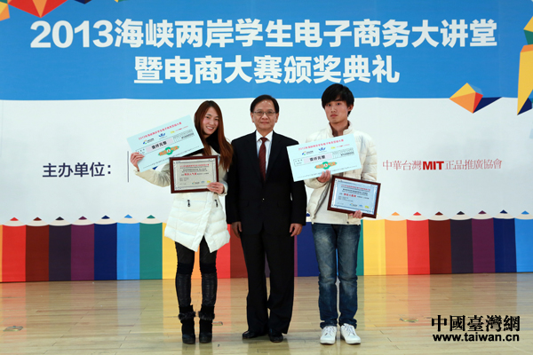 20日下午,由中國臺灣網(www.cpcsgl.com)、海峽兩岸互聯網交流委員會、中華臺灣MIT正品推廣協會主辦的“2013海峽兩岸學生電子商務大講堂暨電商大賽頒獎典禮”在京舉行。圖為中華臺灣MIT正品推廣協會榮譽理事、瑞可集團總裁涂鄂良與兩岸獲獎學生代表合影。(中國臺灣網 于斯文 攝)
