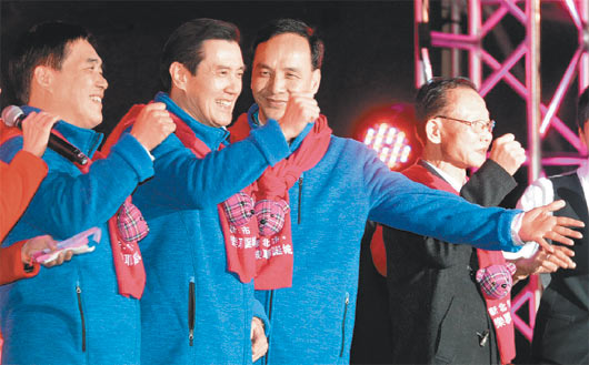 新北圣誕演唱會(huì)上,馬英九(左二)、郝龍斌(左一)、朱立倫(左三)三人同臺(tái),氣氛活躍。(圖片來(lái)自臺(tái)媒)