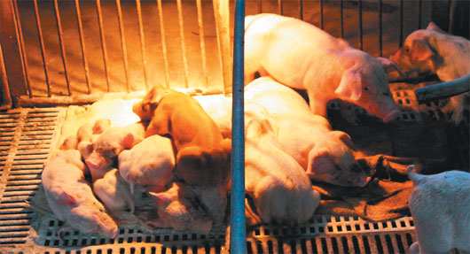 記者鏡頭下感染腹瀉的仔豬(左)與正常仔豬(右)相比明顯羸弱。臺灣聯合報提供