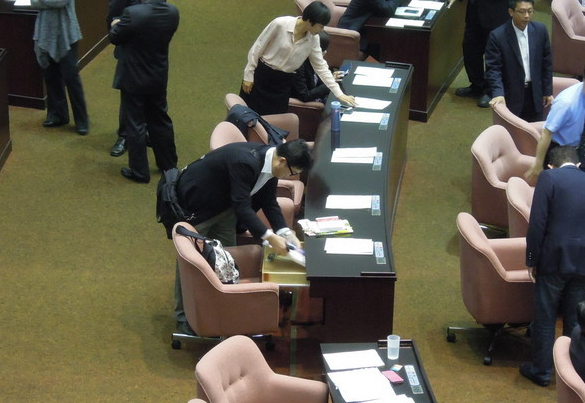 中國臺灣網(wǎng)4月11日消息 據(jù)臺灣“東森新聞“報道,臺灣“立法院”議場經(jīng)歷24天反服貿(mào)群眾占據(jù),吃喝拉撒全在議場內(nèi),加上學(xué)生沖入議場時的破壞,即使“立院”人員連夜趕工,1樓大致恢復(fù)原樣,但2樓地毯及座位區(qū)仍可看到群眾遺留的痕跡。