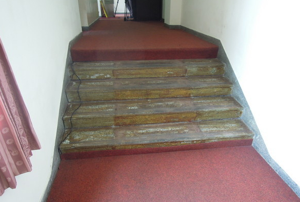 2樓走廊階梯整片地毯拆除,記者室天花板也全部換新。(臺媒圖)