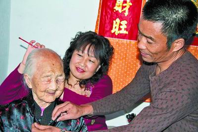 余俊新的妻子程紅軍說:“奶奶脾氣好,性格開朗,心胸很寬,我到余家近20年了,從來沒見奶奶發(fā)過火。奶奶平時很少生病,偶爾有個頭疼腦熱的,就馬上看醫(yī)生,吃藥不見效,就要求打針。奶奶說,小病不治,延誤了,就要花大錢。奶奶從不諱疾忌醫(yī)。”