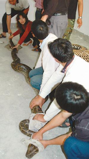 隨后,接到報告的野生動植物保護站工作人員趕到現場,將蟒蛇裝進一個大竹籠拉回林業站,這條蟒蛇沒有一點反抗。