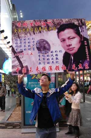 在黃興路步行商業街,阿杰雇人舉著自己的征婚廣告進行宣傳