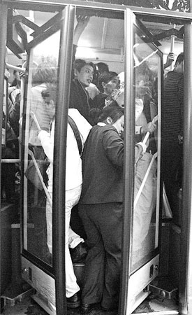 記者在花卉園擠上一輛202路公交車,僅后車門處就擠了10余人。當(dāng)行駛到紅旗河溝建瑪特車站時(shí),因?yàn)槿颂鄵踝∠萝嚨某丝停驹陂T邊的售票員被擠到門下等待。誰知,剛有5人下車,又有十余人拼命往車上擠,此時(shí)車門都已經(jīng)無法關(guān)閉,售票員根本無法擠上車。“我上不了車,你們都走不了!”售票員大叫,這時(shí)過道的乘客又拼命往車內(nèi)擠,大家挪出一小空位,售票員才擠上車,果然證實(shí)了網(wǎng)友的話。