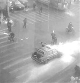 昨日上午8時許,沈陽市鐵西區肇工街與勛業三路交叉路口,勞動公園西南角的馬路上,一輛正在行駛中的出租車突然起火。