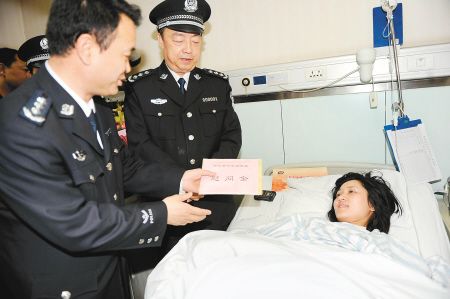 省公安廳廳長王銳及西安市公安局局長杜航偉看望受傷女交警張昂。 記者 翟小雪 攝