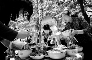 昨天中午12點,康宏小區18幢樓下小花園的石桌上,擺滿了十多道香氣四溢的佳肴。石桌旁的兩張木制飯桌旁,圍站著近30位小區居民:有70多歲的老人、還有牙牙學語的孩童……他們手中都拿著自帶的碗筷,正等著劉奶奶開席。
