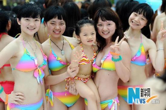 5月9日,4歲大的勞穎瑩小朋友(中)和大姐姐們一起參加“廣州我撐你”漢字比基尼造型活動。當日,為表達廣州市民對2010年廣州亞運會的支持,長隆水上樂園舉辦了由1940名女士參加的“廣州我撐你”漢字比基尼造型活動,刷新了去年在這里創造的1290人的吉尼斯世界紀錄。新華社記者劉大偉攝