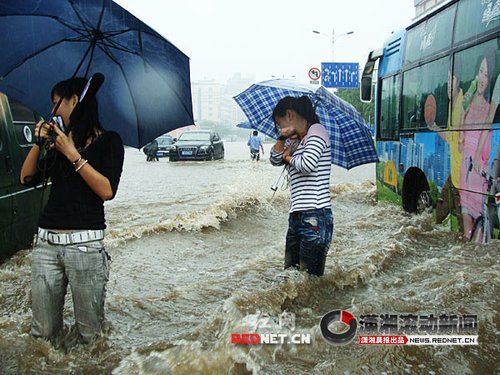 (5月13日上午,株洲長江廣場出現(xiàn)大面積積水,現(xiàn)場已經是一片汪洋了。兩位電視臺的記者在現(xiàn)場采訪。圖/瀟湘晨報滾動新聞通訊員 青琪)