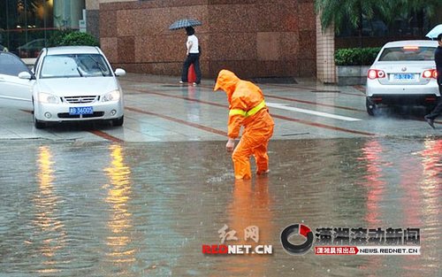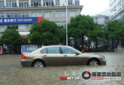 上午10點左右,記者趕至長江北路長江廣場時,那里已經出現(xiàn)大面積積水,株洲天元交警對長江廣場到韶山路口實施了交通管制。路邊一些行人則在脫鞋,準備光腳過馬路。一些底盤較低的轎車選擇“硬沖”,結果行至路中間熄火了。駕駛湘AA8279寶馬轎車的司機就是其中之一,“我沒想到水有這么深,所以才開過來,結果熄火了。感覺開車跟開船似的。”
