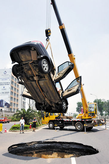 上周五,陷入南昌街頭塌陷路面上的小轎車被吊離現場 新華社 發
